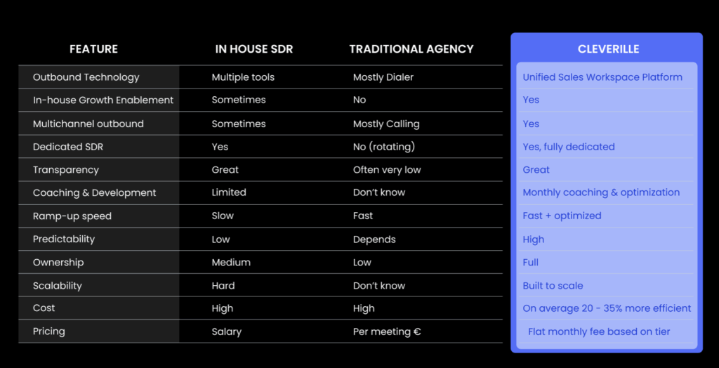 - All your sales reps benefit — full access to the Cleverille platform included with our SDR service